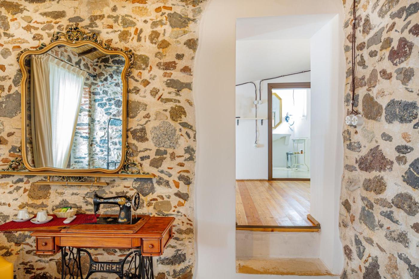 Junior Suite - Split Level. This Suite is spacious and located in a historic building, 100 meters away from the main buildingthe Reception and breakfast area are located. It is located on the ground floor and overlooks the internal court yard. The large double bed is on the ground level and the single bed and the bathroom with shower are down stairs on the lower level. ;